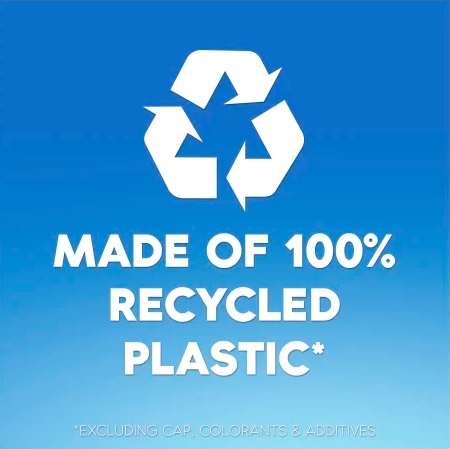 The bottle is made of 100% recycled plastic (excl. cap, colourants & additives) and is recyclable (excluding cap and depending on recycling facilities)