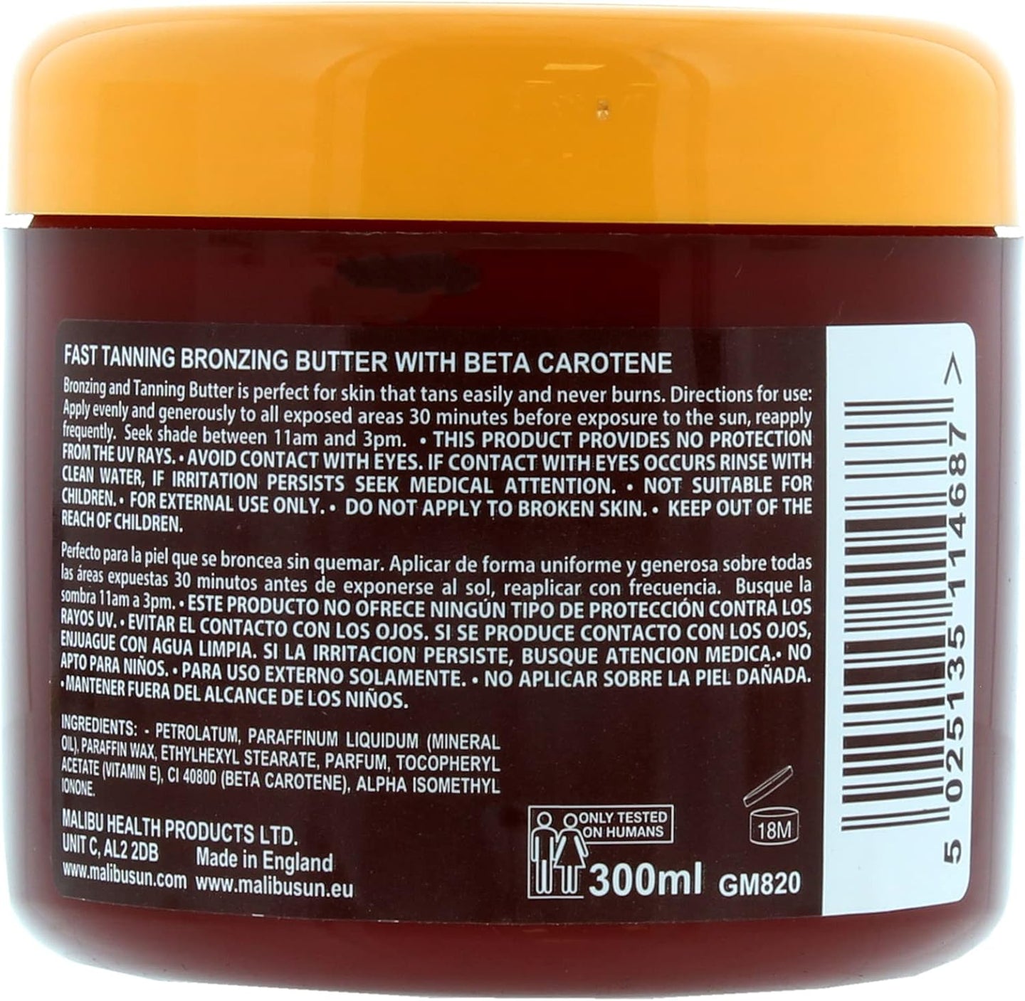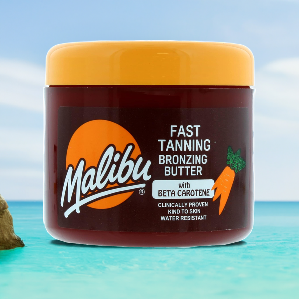 For over 20 years, Malibu has been creating quality and affordable 'sun protection for every body'. Our comprehensive range of formulas and SPFs suit all ages and skin requirements. Malibu Fast Tanning Body Butter is specially formulated with Beta Carotene to aid the skins natural tanning process by encouraging the skin's dark pigment to the surface. This nourishing formula will leave skin glowing and with the scent of Malibu’s world-famous tropical coconut. This body butter nourishes your skin with Vitamin E, keeping your skin moisturised and smooth, as well as water and sweat resistant. Each one of our pots are made in England and clinically proven to be kind to skin, and only ever tested on humans.